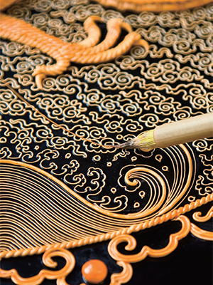 漆線雕是以精細的漆線經特殊製作方法纏繞出各種金碧輝煌的人物及動物形象,尤以民間傳統題材如龍鳳、麒麟、雲水、纏枝蓮等為多。線條粗細各異、連綿不斷,紋理重迭、豐富立體,顏色華麗非凡、光彩奪目,這是廈門漆線雕帶給人的視覺藝術享受。