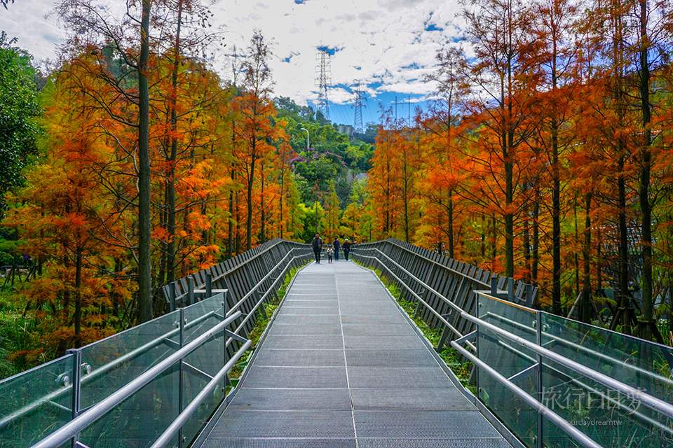 走入福道,水杉林斑斕紅葉在眼前展開......。